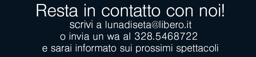 Il prossimo appuntamento è per venerdì 21 marzo alle ore 21 al teatro Summarte di Somma Vesuviana (Na). Prezzo biglietto 12€, sconto promozione e abbonati teatro 10€. Prenota a lunadiseta@libero.it o 328.5468722
